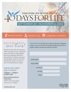 Is your chance to join thousands of local Christians in 40 Days of prayer and fasting, peaceful vigil, and community outreach to END abortion in our community.