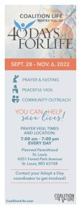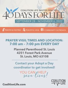 Join thousands from across the Greater St. Louis Area to stand and offer free pregnancy options, sidewalk counseling, silent prayer, and community witness in the public right-of-way in front of the local abortion facilities in St. Louis and Fairview Heights.
